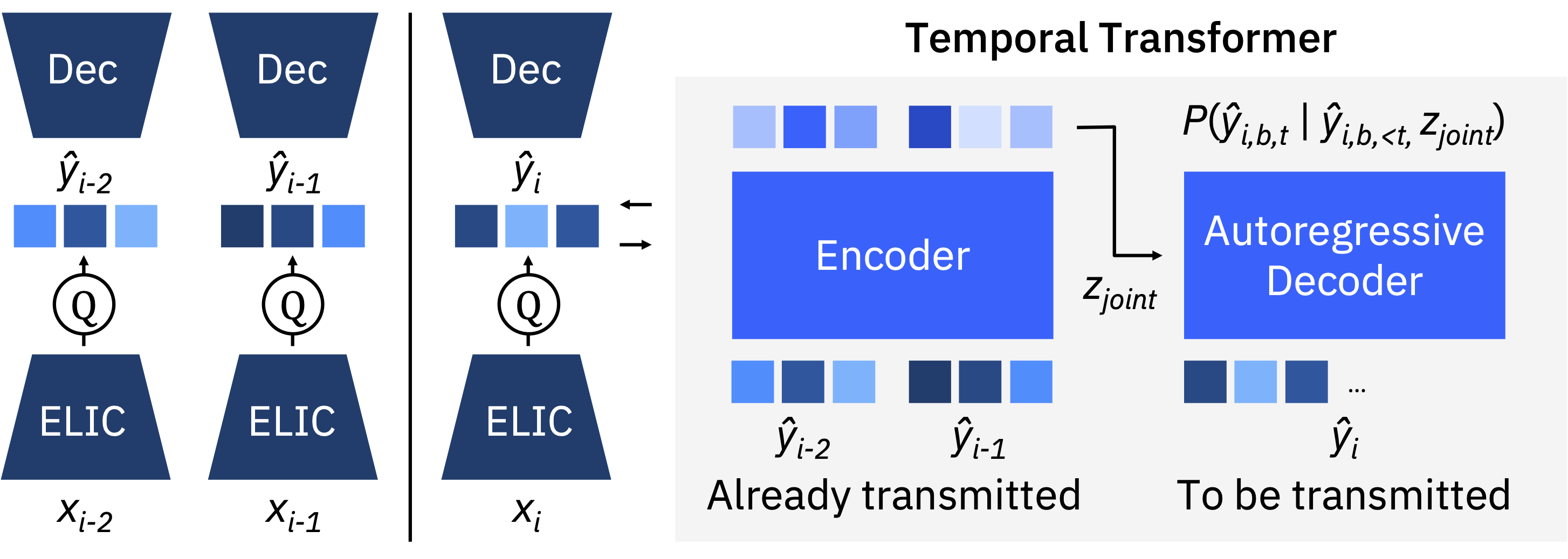 TEC-TT extends the TerraCodec image codecs by modeling temporal dependencies across satellite image sequences. Each frame is first encoded using an ELIC-style CNN encoder–decoder to obtain latent representations. A temporal transformer then predicts the probability distribution of the current frame’s latents conditioned on previously encoded frames.